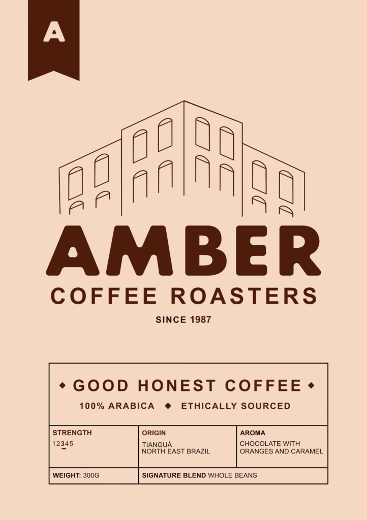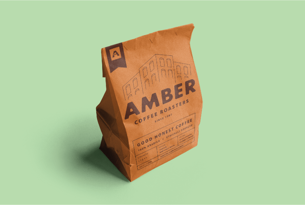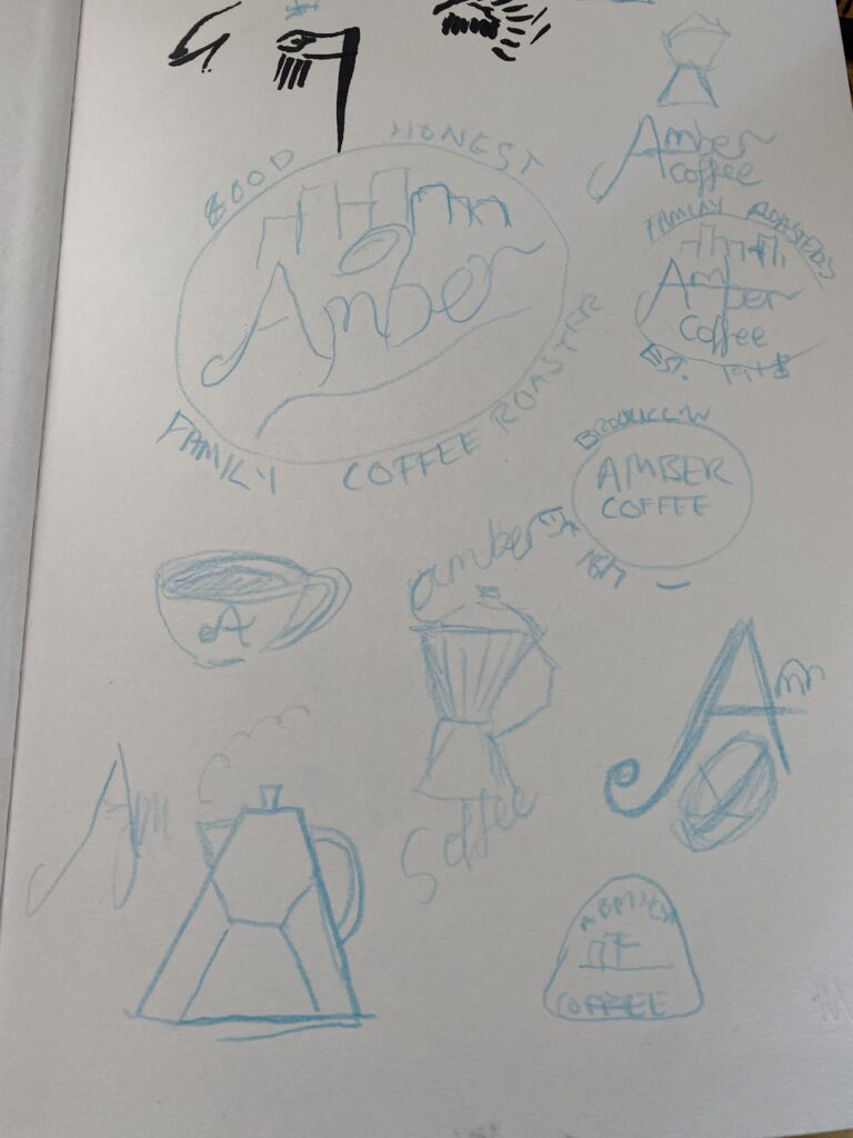 I started off with a hand drawn logo, a A in the form of a carafe and various other inspirations from the moodboard I had created. Eventually settling on a slight tweaked bold A for the main logo with a straightforward sanserif typeface and an interpretation of the iconic Brooklyn buildings as background, incidental imagery. The colours were inspired by Amber’s warm yellow/orange and the browns of delicious coffee!